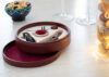 Caja circular en madera con interior acolchado y cuatro accesorios para vino con detalles naturales. Una pieza elegante para quienes valoran lo artesanal.