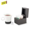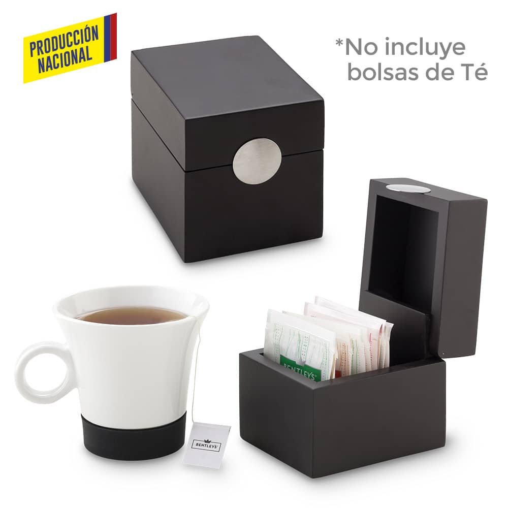 Caja de té fabricada en MDF con acabado lacado y placa metálica decorativa. Contiene compartimentos internos para sobres de té o endulzantes.