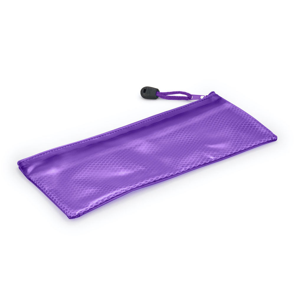 Cartuchera escolar en plástico con cierre superior y compartimiento interior de malla. Resistente y fácil de limpiar.