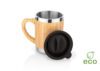Mug de acero inoxidable con exterior en bambú natural. Tapa corrediza y asa lateral para transporte cómodo. 300 ml.