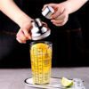 Mezclador de vidrio con capacidad de 400 ml y tapa de acero inoxidable. Incluye guía impresa con recetas de cocteles.