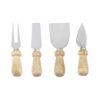 Set de quesos con tabla y utensilios en acero y madera natural. Incluye tres cuchillos, un tenedor y estuche con caja individual. Cada pieza puede variar por la veta natural de la madera.